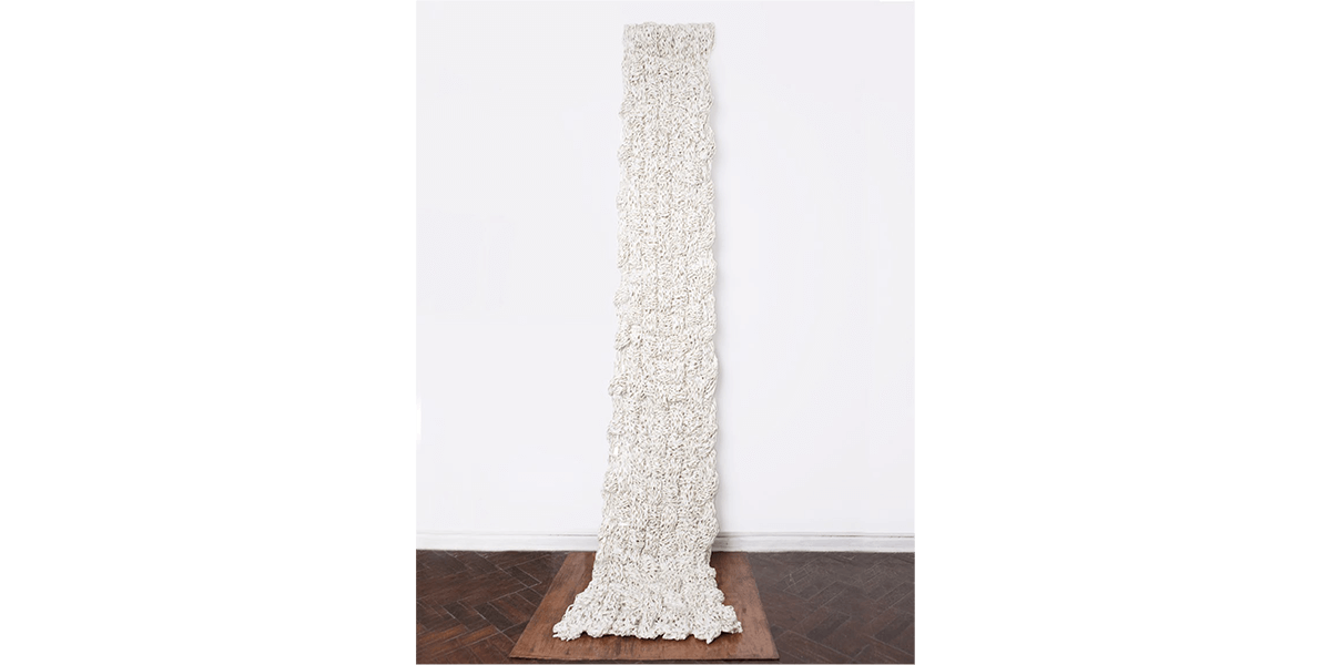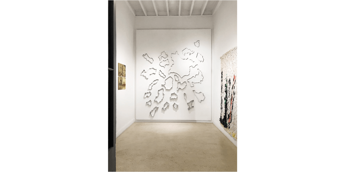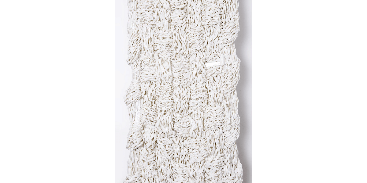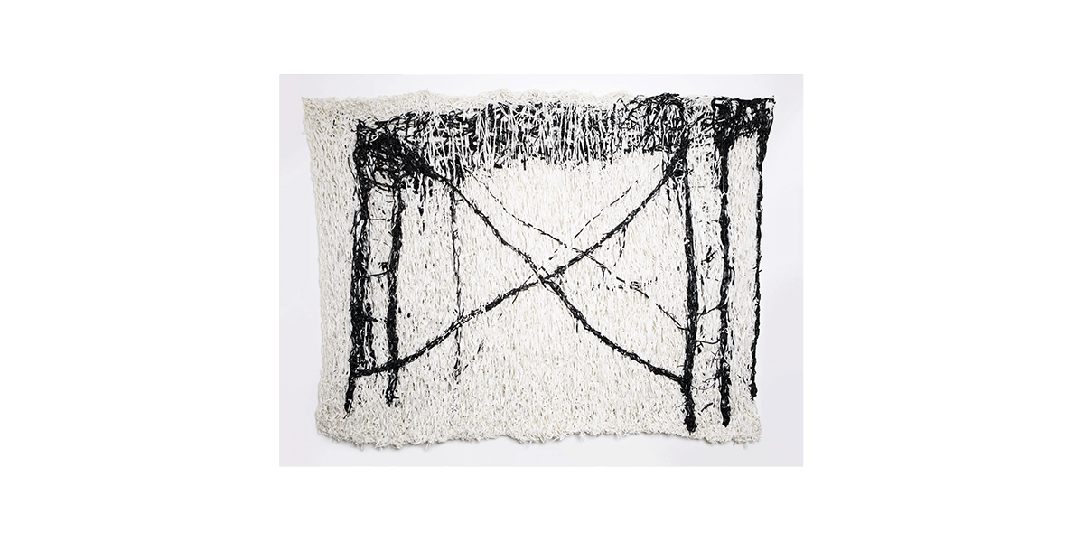 La reproducción en serie de estos elementos evoca una vuelta al origen —aunque el original sea inexistente— en el afán de (re)encontrarse con lo primitivo que anida dentro de uno mismo y que se proyecta en el afuera. Cárdenas los denominará: “Puertas”, “Ventanas” y “Yesos”. El resultado será un despliegue de puertas encendidas que se abren y se cierran; ventanas oscuras que se proyectan al infinito; y cuerpos en movimiento. Siendo el yeso uno de los materiales primarios para la escultura —en tanto remite a la antigüedad— y con el cual se crea moldes o piezas a través de la técnica del vaciado, no es casual que la artista dote con este nombre a lo que concibe como cuerpo. Así, expone tres piezas tejidas en las que la rafia blanca forma una trama con la urdimbre compuesta por hilos de cobre y bronce, y en las que la rafia negra se inmiscuye —a manera de subtextos, hasta ocupar ciertas zonas que, incluso, podrían insinuar la forma humana—.