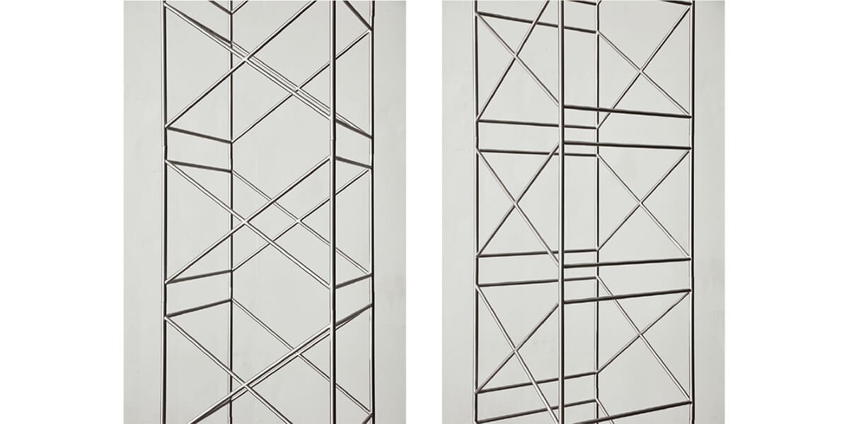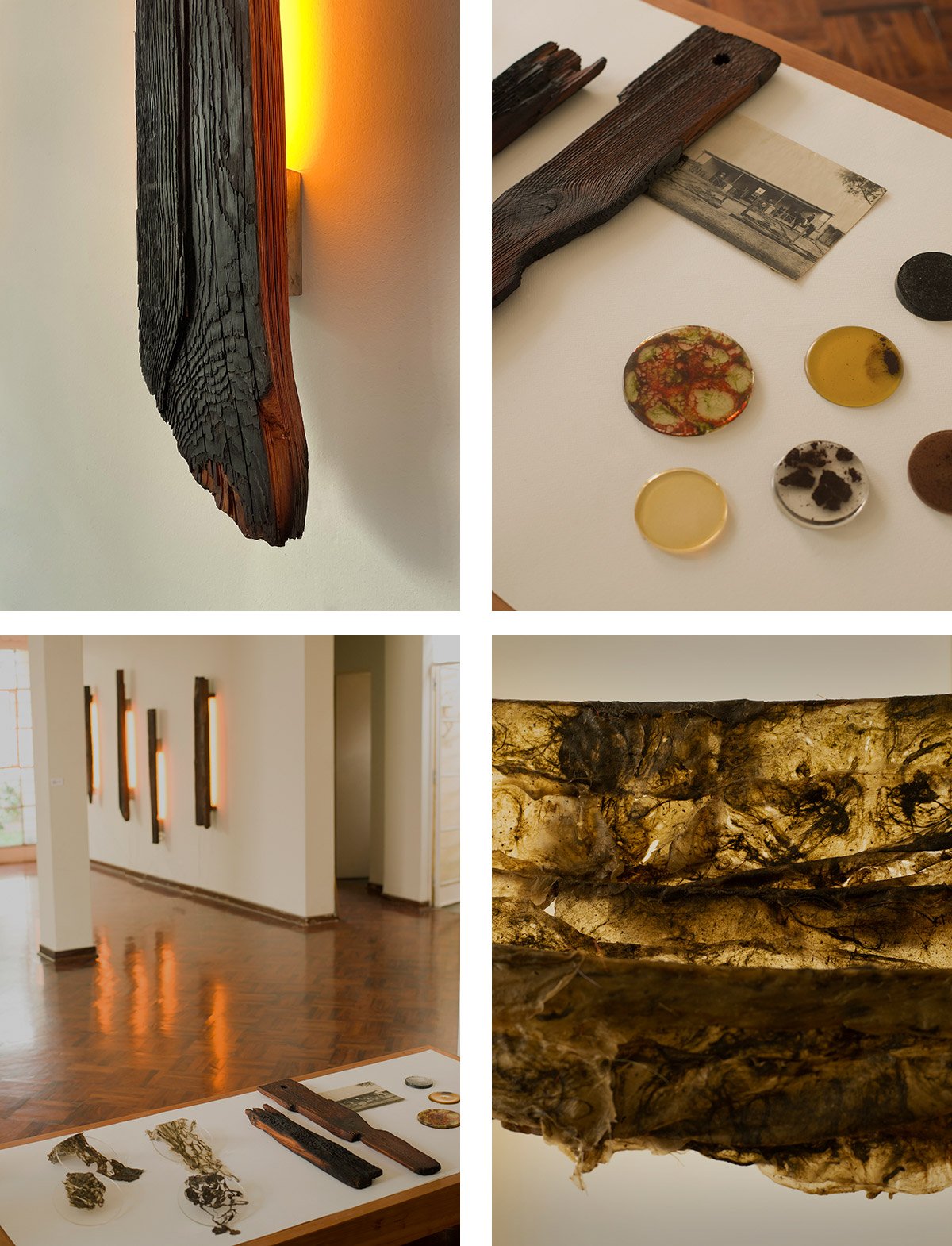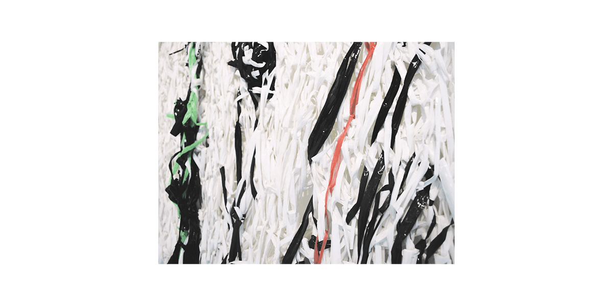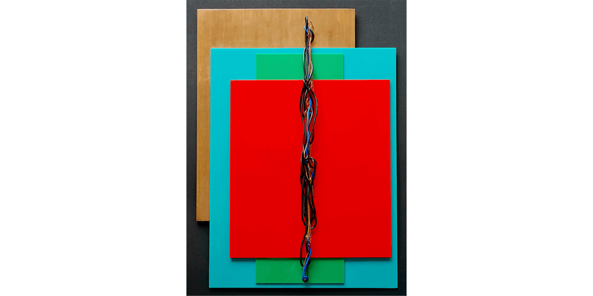 La reproducción en serie de estos elementos evoca una vuelta al origen —aunque el original sea inexistente— en el afán de (re)encontrarse con lo primitivo que anida dentro de uno mismo y que se proyecta en el afuera. Cárdenas los denominará: “Puertas”, “Ventanas” y “Yesos”. El resultado será un despliegue de puertas encendidas que se abren y se cierran; ventanas oscuras que se proyectan al infinito; y cuerpos en movimiento. Siendo el yeso uno de los materiales primarios para la escultura —en tanto remite a la antigüedad— y con el cual se crea moldes o piezas a través de la técnica del vaciado, no es casual que la artista dote con este nombre a lo que concibe como cuerpo. Así, expone tres piezas tejidas en las que la rafia blanca forma una trama con la urdimbre compuesta por hilos de cobre y bronce, y en las que la rafia negra se inmiscuye —a manera de subtextos, hasta ocupar ciertas zonas que, incluso, podrían insinuar la forma humana—.