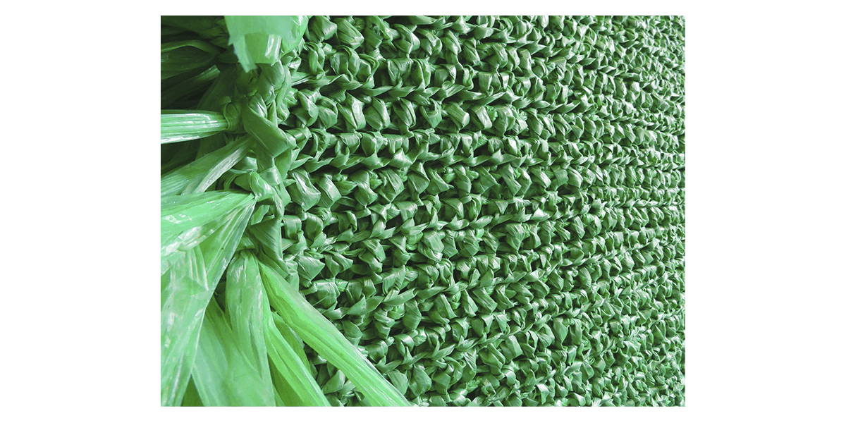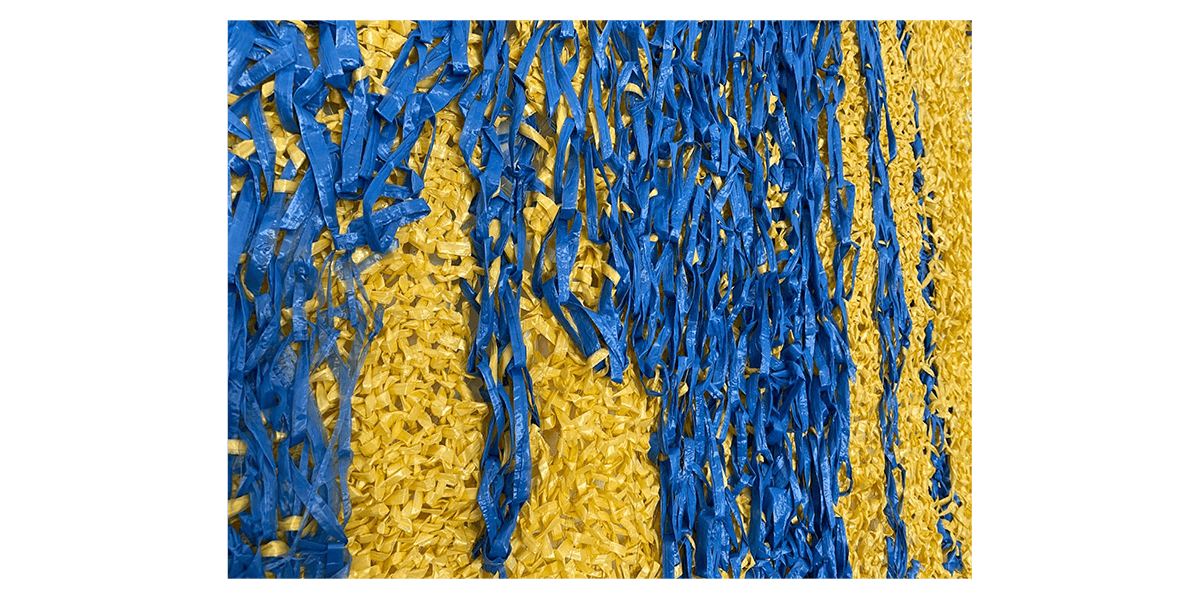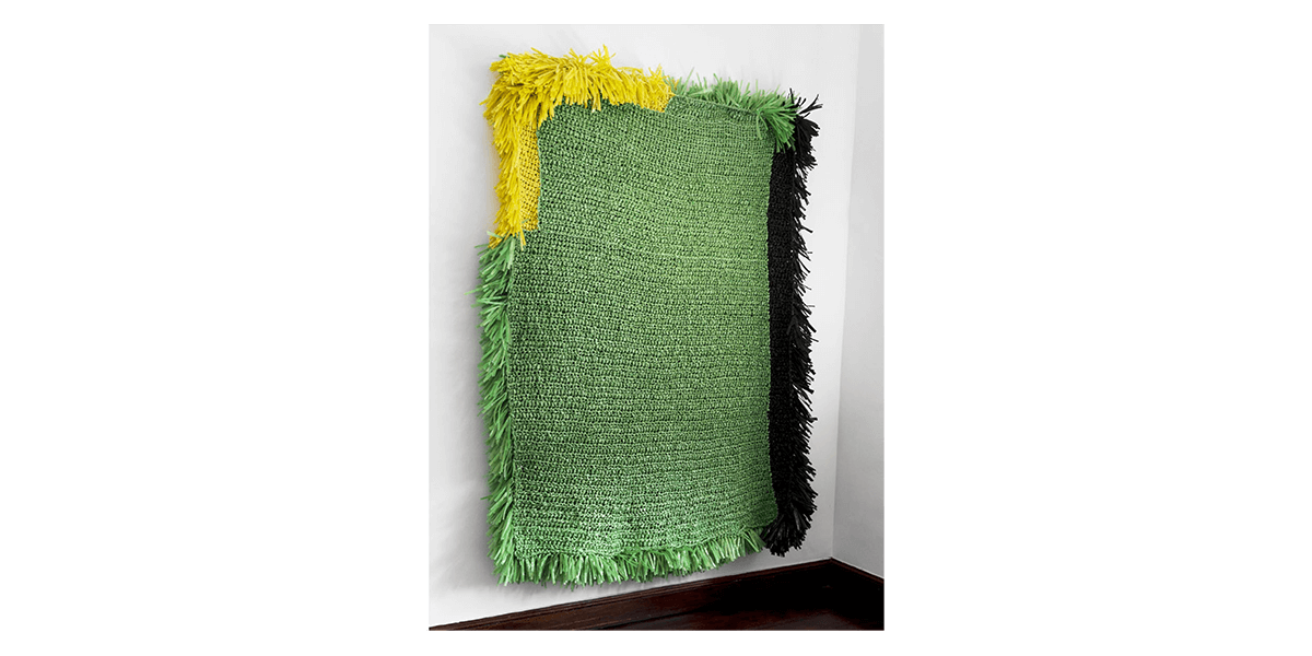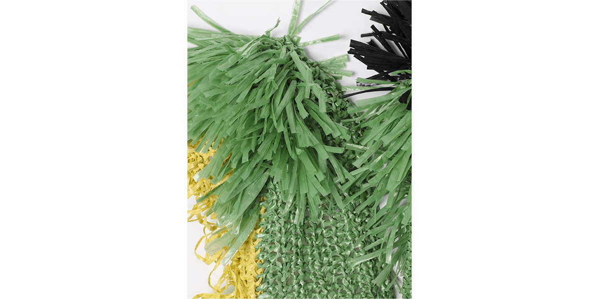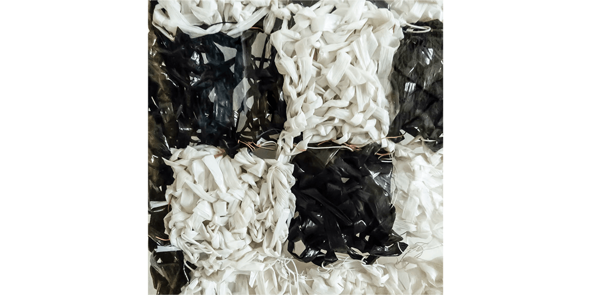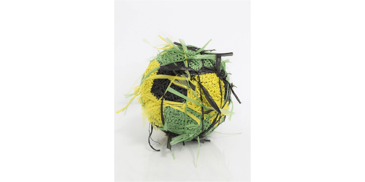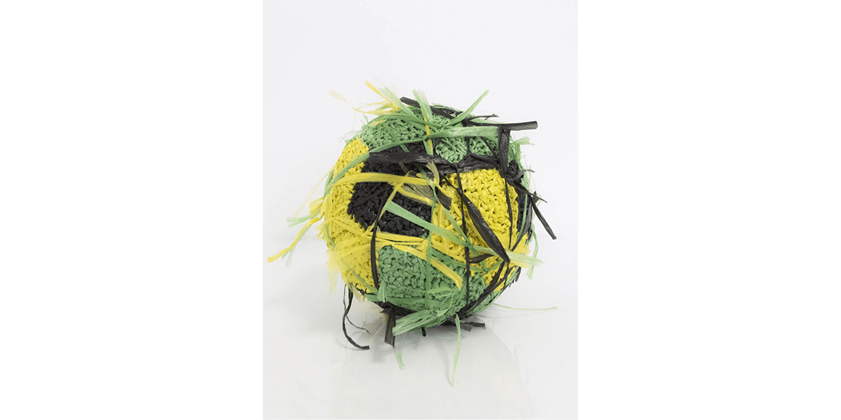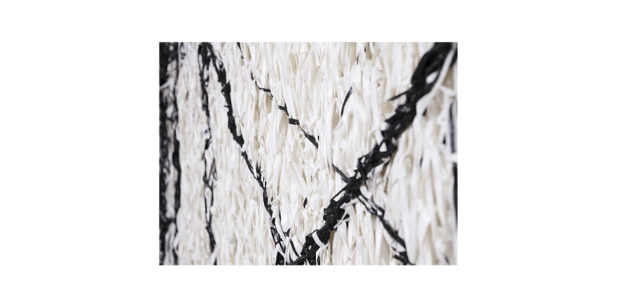 Las obras colectivas han sido elaboradas en rafia, material usado en objetos prácticos como redes, sacos y bolsas que, sin embargo, en este conjunto adquiere una belleza particular. Las piezas remiten además a una práctica ancestral en el Perú, la del textil -en efecto, ellas se asemejan a un gran manto emplumado o a un tejido de punto. Pero, además, el tejido hace referencia a la idea de construcción, el ir añadiendo y entrelazando fibras, como un cuerpo social que se une para alcanzar un objetivo. La técnica refuerza la idea detrás de las piezas mismas: son objetos que refieren a conceptos como construcción, unión y soporte.
