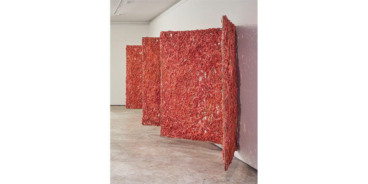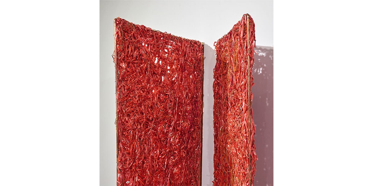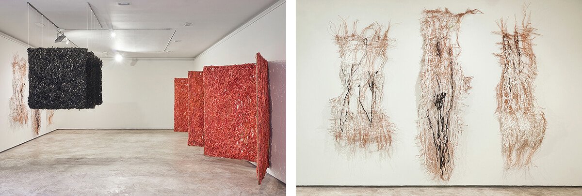 A través del tejido con rafia, cobre y bronce, Nani Cárdenas procura sumergir al espectador en la intensidad del color (rojo, negro y blanco) y en el trazo primigenio que se anuda en el afán de ser cuerpo, masa, profundidad. El tejido —como piel— expone zonas donde los materiales se contraen y se distienden, permitiendo que la luz atraviese los espacios porosos. Así, las sombras de los cuerpos escultóricos dispuestos en series se proyectan en el espacio expositivo recordando que se es luz y oscuridad.