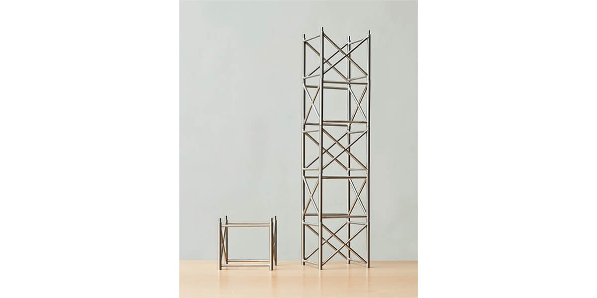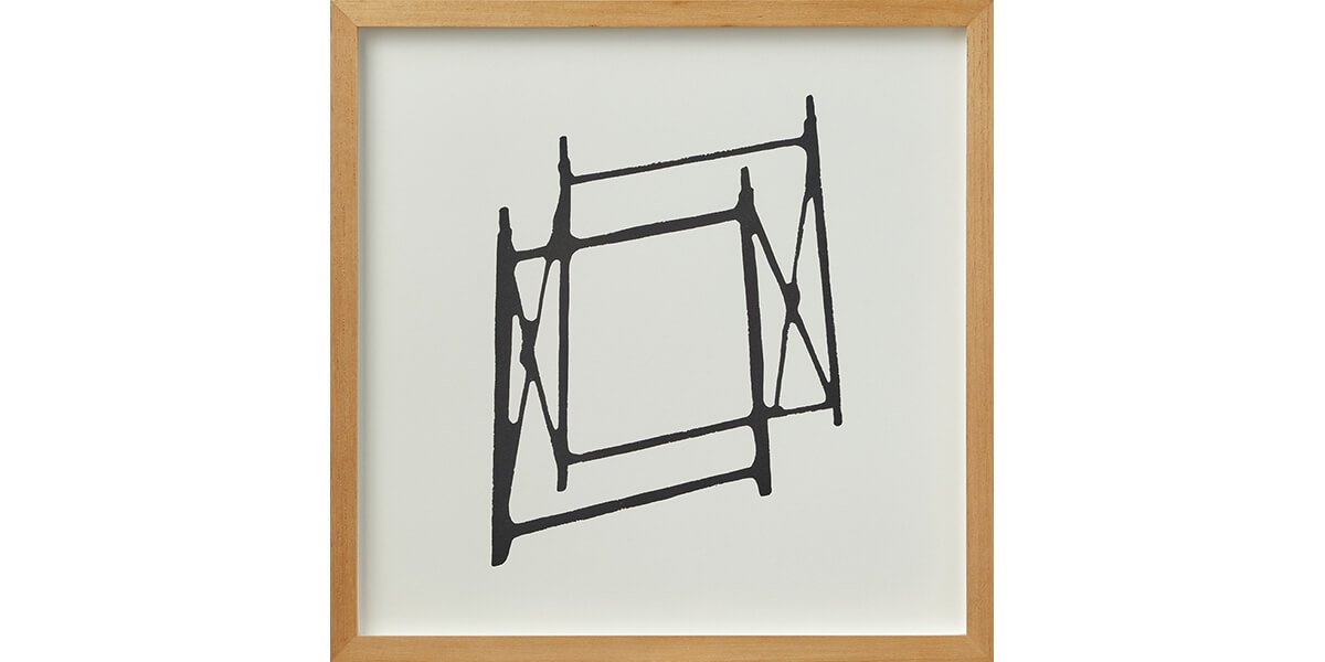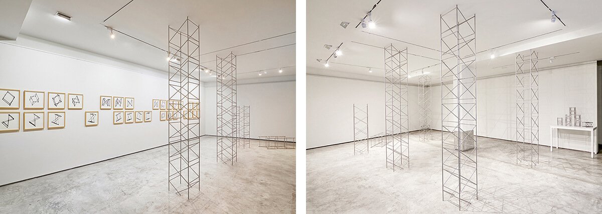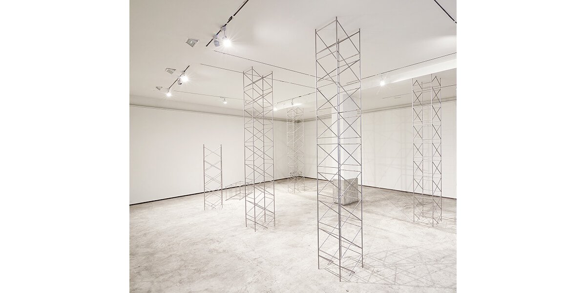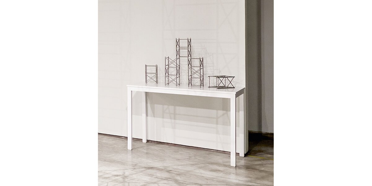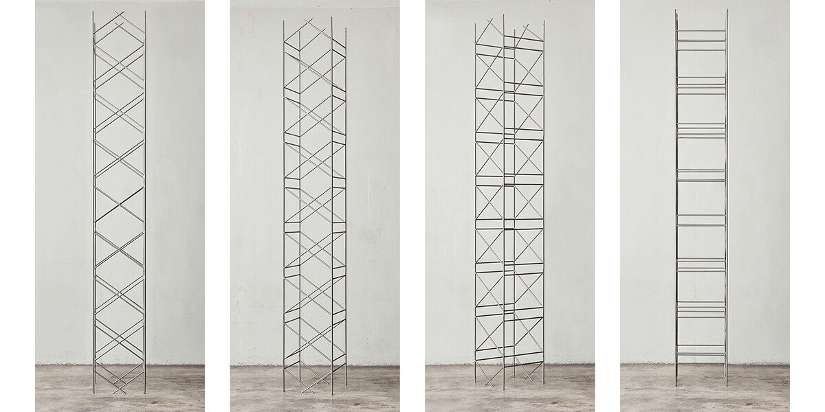 Entablando diálogo con la reproducción, Micaela Aljovín presenta una pieza matriz —en forma de andamio— que será la base para la construcción de un discurso que revela la fragilidad y pone en crisis lo aparentemente sólido. En una puesta en escena que rememora los módulos con que se jugaba en la infancia, cinco columnas dispuestas simétricamente en el espacio expositivo simulan emerger desde el suelo atravesando el techo. Sin perder su carácter lúdico, se vale de un módulo —que no es otro que la reproducción de la pieza matriz a escala menor— para registrar la proyección de su sombra en movimiento. El resultado es una serie de 30 serigrafías que resaltan la imposibilidad de construir desde la individualidad; a la vez que invitan al visitante a construir una posibilidad.
