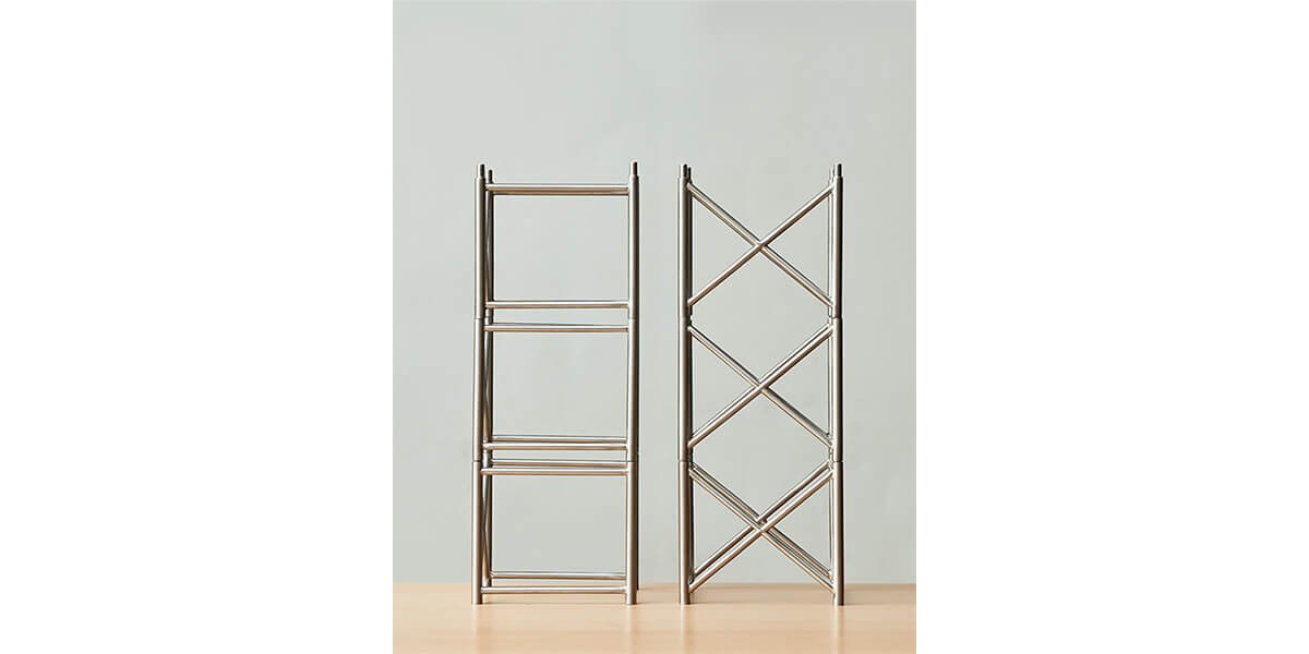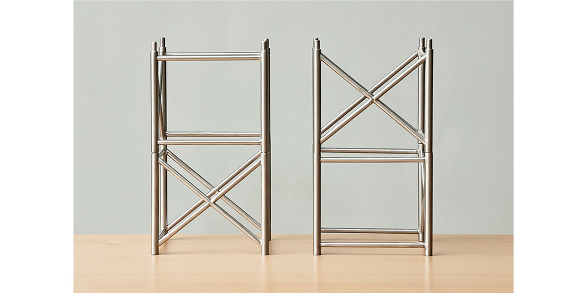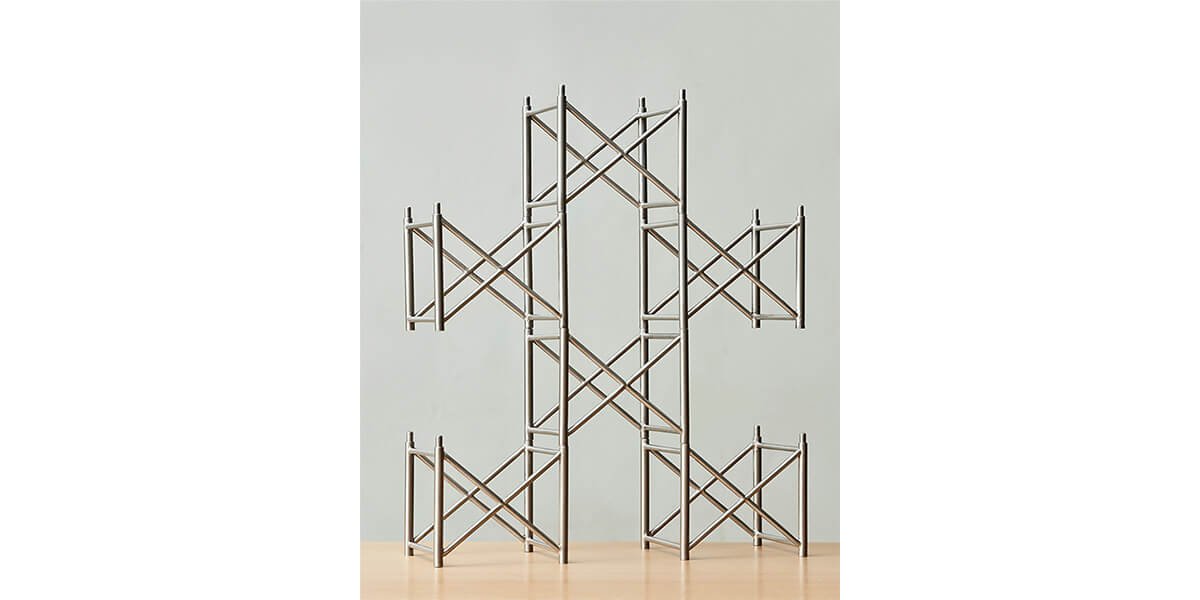 Entablando diálogo con la reproducción, Micaela Aljovín presenta una pieza matriz —en forma de andamio— que será la base para la construcción de un discurso que revela la fragilidad y pone en crisis lo aparentemente sólido. En una puesta en escena que rememora los módulos con que se jugaba en la infancia, cinco columnas dispuestas simétricamente en el espacio expositivo simulan emerger desde el suelo atravesando el techo. Su apariencia genera la ilusión óptica de ser estructuras seguras y resistentes, que soportan tanto la galería como el edificio que se erige por encima de esta. Sin embargo, el volumen, consistencia y flexibilidad del material que compone cada una de las piezas que se engastan para levantar las columnas evidencia su fragilidad, exponiendo el artificio y la posibilidad de fractura.