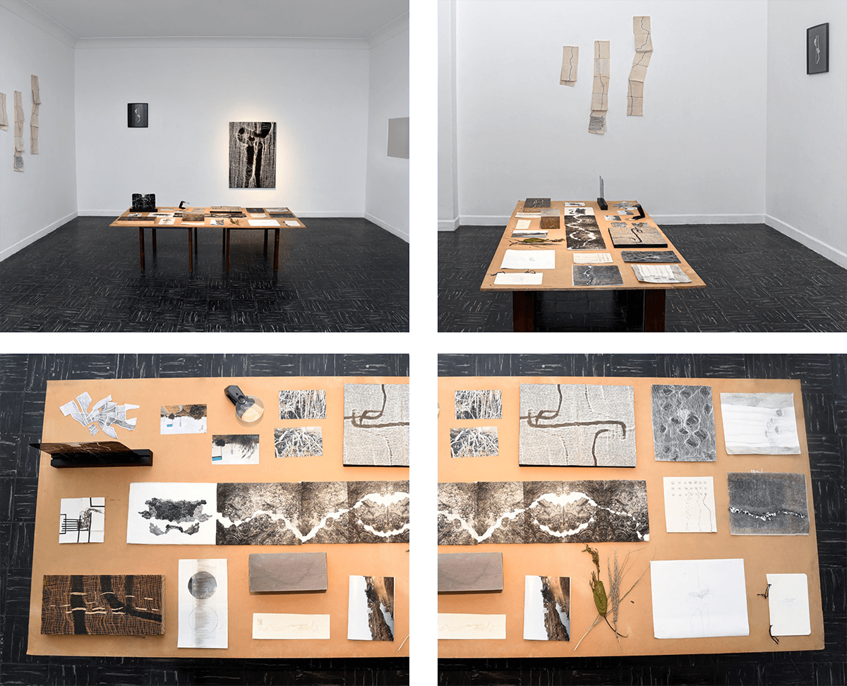 Si la experiencia anterior plasmaba un cuerpo de trabajo vivencial y en comunidad, donde la acción de escuchar se proponía como contraposición a tapar y olvidar, con el objetivo de reconocer y redescubrir la condición vital del río; esta segunda parte del proceso, que corresponde a la residencia realizada en Andamio, expone la reflexión de la artista acerca de su propia condición de ser fluido y de volverse una con la naturaleza a través de la acción de tejer, que contrarresta el tapar. Así, los bocetos y piezas resultantes se presentan a manera de diálogos que la artista establece con esa experiencia anterior y con el material rescatado de las aguas subterráneas del río Surco, invisible a los ojos de quienes transitan la fragmentada ciudad de cemento que se empecina en negar su propia naturaleza.
